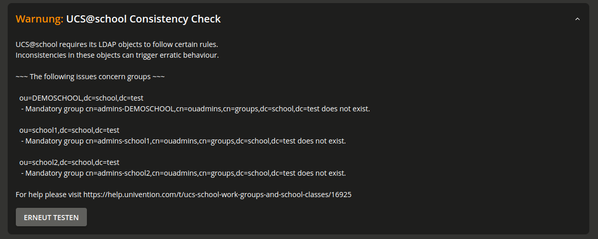 Manual QA in a multiserver env, on primary: - [x] manual QA -> see below - [x] code review - [x] changelog ok - [x] advisory ok - [x] tests pass on vm univention-app info UCS: 5.0-6 errata916 Installed: self-service-backend=5.0 ucsschool=5.0 v4 Behavior before fix: $ ucr set ucsschool/ldap/default/groupprefix/admins="super_people-" service univention-management-console-server restart I renamed the admins group of the existing groups and put the `demo_admin` in this group - cn=admins-DEMOSCHOOL,cn=ouadmins,cn=groups,dc=school,dc=test - cn=admins-school1,cn=ouadmins,cn=groups,dc=school,dc=test - cn=admins-school2,cn=ouadmins,cn=groups,dc=school,dc=test by renaming them in the UMC groups module to have the prefix `super_people-`, .e.g. `super_people-DEMOSCHOOL`. This way they are part of the correct group, only the UCR-variable is not correct. -> see attachment After the fix, I didn't get a warning.