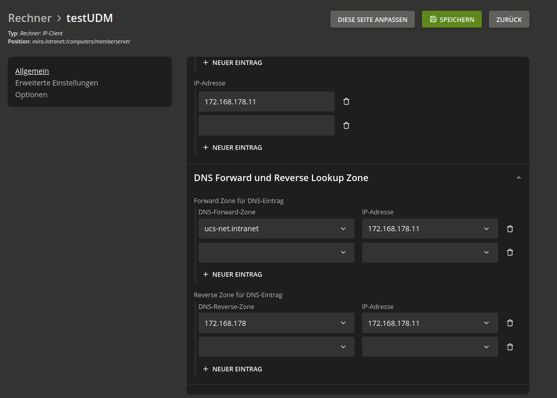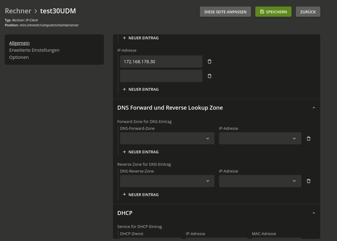 I apologize if there was not enough information on the bug. I have been able to reproduce the customer statement on my test system and no DNS entries are created for the object that I previously created correctly via UDM. My Test-System: univention-app info UCS: 5.0-6 errata974 ucr search --brief role samba4/role: DC server/role: domaincontroller_master system/setup/boot/select/role: true I add attachments to clarify the failure. Used commands to create the object: udm computers/ipmanagedclient create --position "cn=memberserver,cn=computers,dc=miro,dc=intranet" --set name="test30UDM" --set ip="172.168.178.30" --set network="cn=UCS-Net,cn=networks,dc=miro,dc=intranet" udm computers/ipmanagedclient list --filter cn=test30UDM cn=test30UDM DN: cn=test30UDM,cn=memberserver,cn=computers,dc=miro,dc=intranet description: None domain: None fqdn: None ip: 172.168.178.30 name: test30UDM network: cn=UCS-Net,cn=networks,dc=miro,dc=intranet ---------------------------------------------------------- udm computers/ipmanagedclient create --position "cn=memberserver,cn=computers,dc=miro,dc=intranet" --set name="testUDM" --set ip="172.168.178.11" --set network="cn=UCS-Net,cn=networks,dc=miro,dc=intranet" After i add the DNS entries manually via UMC, i get of course the DNS Settings, but this is the regression at this point. udm computers/ipmanagedclient list --filter cn=testUDM cn=testUDM DN: cn=testUDM,cn=memberserver,cn=computers,dc=miro,dc=intranet description: None dnsEntryZoneForward: zoneName=ucs-net.intranet,cn=dns,dc=miro,dc=intranet 172.168.178.11 dnsEntryZoneReverse: zoneName=178.168.172.in-addr.arpa,cn=dns,dc=miro,dc=intranet 172.168.178.11 domain: ucs-net.intranet fqdn: testUDM.ucs-net.intranet ip: 172.168.178.11 name: testUDM network: cn=UCS-Net,cn=networks,dc=miro,dc=intranet ----------------------------------------------------------- In the past we had 2 errata updates for the UDM, so those could be the source for the failure. https://errata.software-univention.de/#/?erratum=5.0x740 https://errata.software-univention.de/#/?erratum=5.0x739 Information from the customer, before the updates were installed, the DNS entries were created correctly. He compared it with a system UCS 5.0-4 errata 726 on which it works correctly.