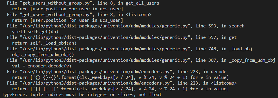 File "get_users_without_group.py", line 8, in get_all_users return [user.position for user in ucs_user] File "get_users_without_group.py", line 8, in <listcomp> return [user.position for user in ucs_user] File "/usr/lib/python3/dist-packages/univention/udm/modules/generic.py", line 593, in search yield self.get(dn) File "/usr/lib/python3/dist-packages/univention/udm/modules/generic.py", line 557, in get return self._load_obj(dn) File "/usr/lib/python3/dist-packages/univention/udm/modules/generic.py", line 748, in _load_obj obj._copy_from_udm_obj() File "/usr/lib/python3/dist-packages/univention/udm/modules/generic.py", line 307, in _copy_from_udm_obj val = encoder.decode(v) File "/usr/lib/python3/dist-packages/univention/udm/encoders.py", line 223, in decode return ['{} {}-{}'.format(cls._weekdays[v / 24], v % 24, v % 24 + 1) for v in value] File "/usr/lib/python3/dist-packages/univention/udm/encoders.py", line 223, in <listcomp> return ['{} {}-{}'.format(cls._weekdays[v / 24], v % 24, v % 24 + 1) for v in value]